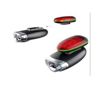 Zestaw Bike Light składa się z dwóch części: oświetlenia przedniego z główną diodą LED oraz dwiema, zwiększającymi widoczność, diodami bocznymi. Lampka jest wodoodporna, czas działania w maksymalnym trybie świecenia wynosi 12 godzin, a parametry jasności w trybie maksymalnym, to 35 Lumenów. Oświetlenie tylne ? także wodoodporne, jest jednocześnie odporne na upadki, działa 30 godzin. Do każdego zestawu dołączone są baterie AA oraz AAA niezbędne do działania lampek.